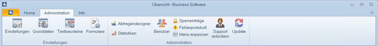 Das Einrichten der GEMADE Business Software erfolgt über den Reiter »Administration« in der oberen Menüleiste. In der »Administration« erfolgen die zentrale Datenpflege zum jeweiligen Mandanten (Firma) als auch die Konfiguration der Software. Alle Einstellungen beziehen sich auf den angemeldeten Mandant.