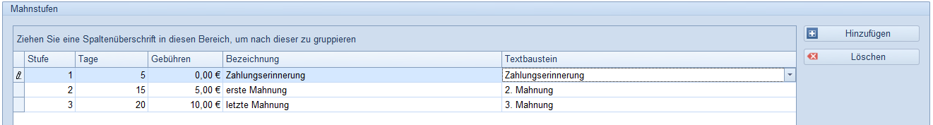 Die Mahnstufen sind beliebig definierbar und an die Geschäftsbedingungen eines Mandanten anpassbar. Die GEMADE Business Software wird mit einer Vorlage für ein stufenbasiertes Mahnwesen ausgeliefert. Die drei Mahnstufen können an die jeweiligen Geschäftsbedingungen angepasst werden. Die Gültigkeit der einzelnen Mahnstufen wird mit den Tagen nach der Rechnungsfälligkeit bestimmt. Jeder Mahnstufe kann ein individueller Textbaustein zugewiesen werden. Die Textbausteine selbst sind im Administrationsbereich »Textbausteine« definiert.