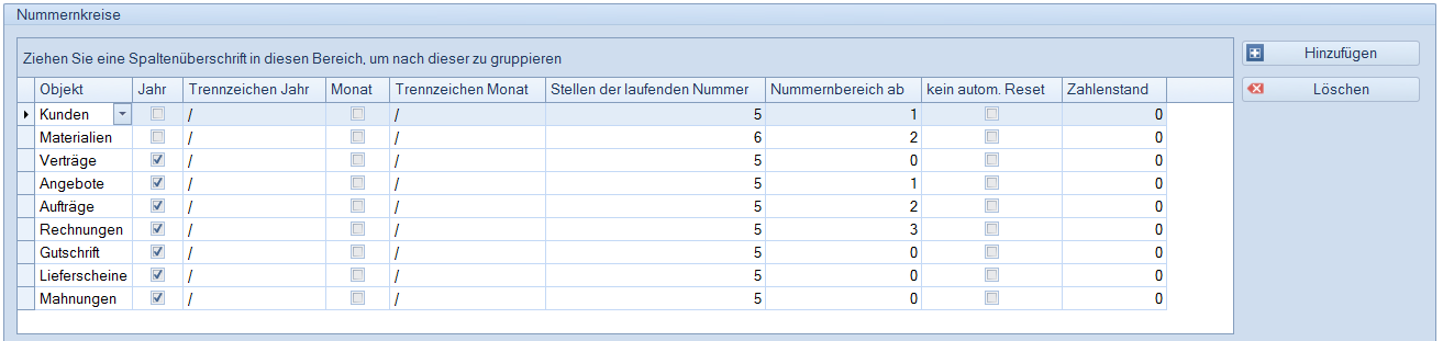 In diesem Einstellungsbereich werden die Nummernkreise bestimmt für: