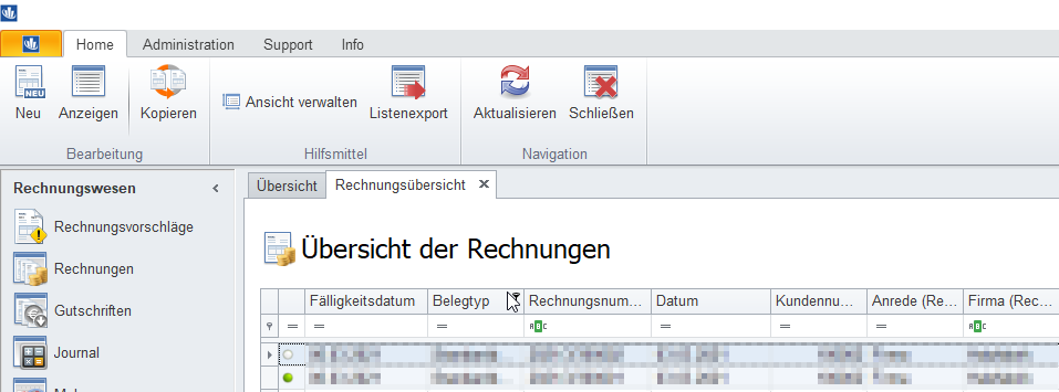 | Listenexport | Exportiert die aktuelle Einträge der Rechnungsübersicht |