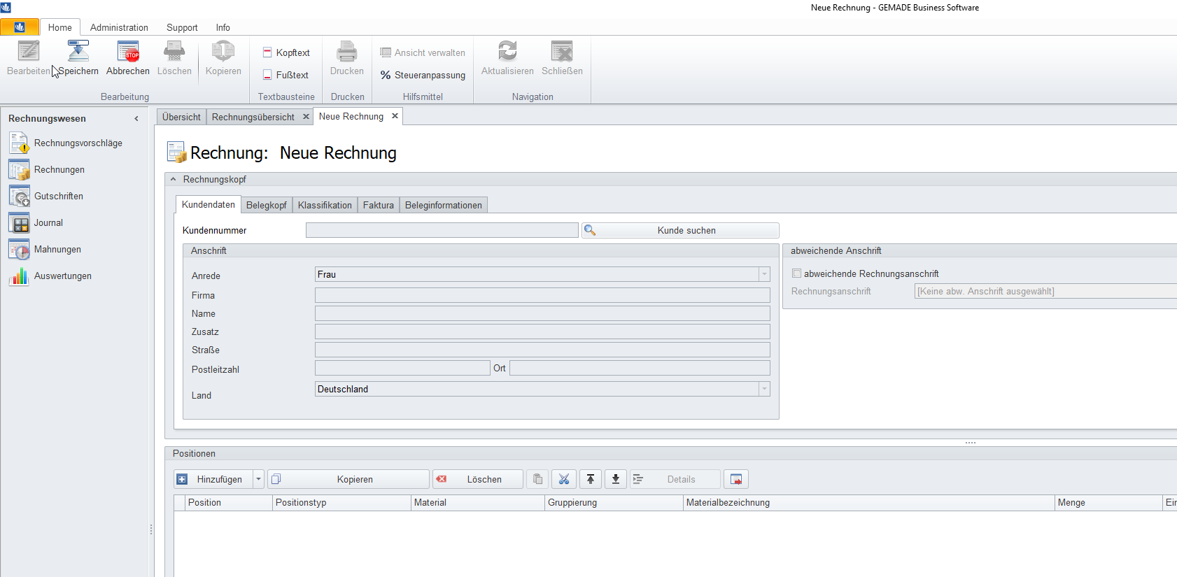 Aus der Rechnungsübersicht heraus, wird über über den Menüpunkt »Neu«, eine neue Rechnung erzeugt.