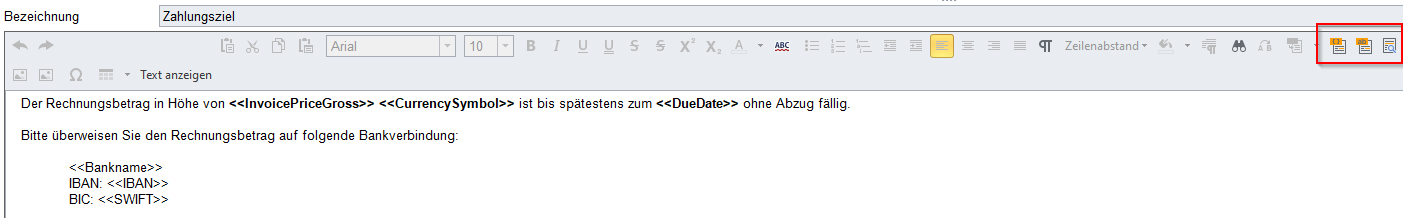 Für die Textbausteine ist eine Vielzahl von Platzhalter für dynamische Datenfelder verfügbar. Bei Anwendung der Datenfelder werden diese automatisch bei der Ausgabe durch Datenwerte ersetzt.